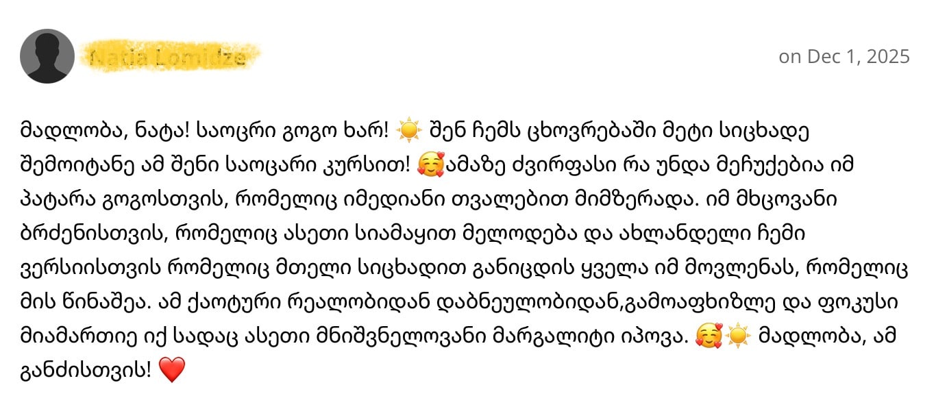 “დიდი მადლობა ნატა! შენ ისეთ სიღრმეებში ჩაგვახედე ყველა, ისეთი მიმღებლობა გამიჩინე, ისეთი სიყვარული გამიღვიძე. პერფექციონიზმი, ბრაზი, ეგო… ყველაფერი გავუშვი.. მადლობა შენ ამ საოცარი გარდასახვისთვის. ”