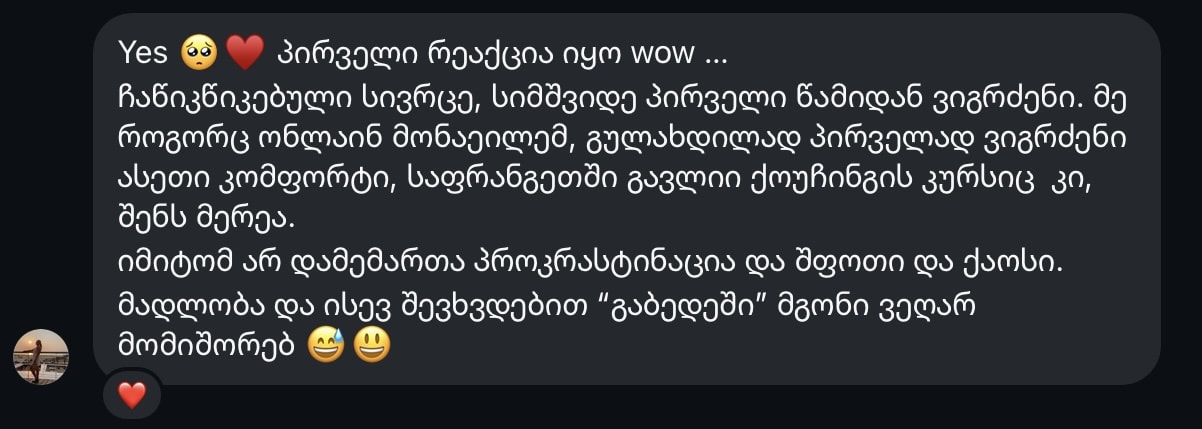 “მეექვსე დღეა და შეგრძნება მაქვს, რომ მთელი ცხოვრება შენს გაკვეთილებს ვუსმენ. მადლიერი ვარ ცხოვრების, ჩემი თავის და შენი, რომ ამის შესაძლებლობა მომეცა.